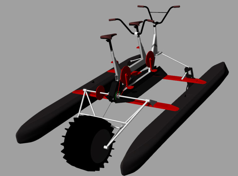 後輪のタイヤが ❝ヒレ❞を持っていて水をかいて水上を進む方式です。この場合陸上を走行する際にタイヤの転がり抵抗が相当高くなり、人力ではじいちゃんにはつらいはず・・・