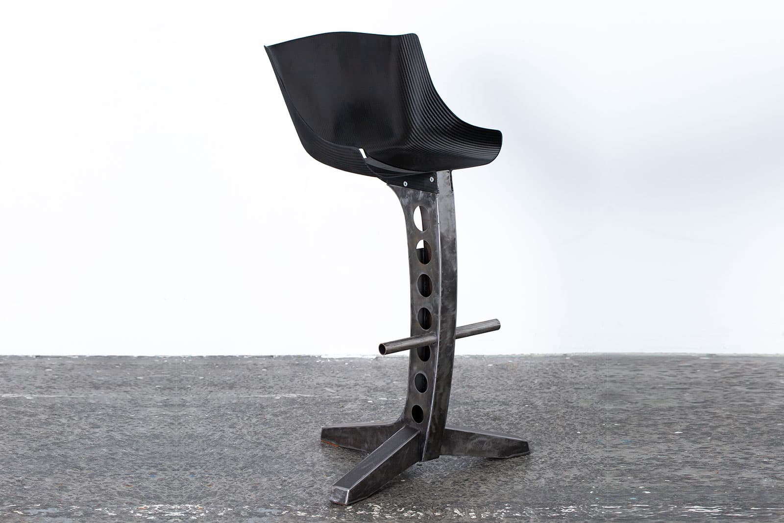 The iron part has a weathered finish, and the contrast with the carbon fiber seat is a highlight.
